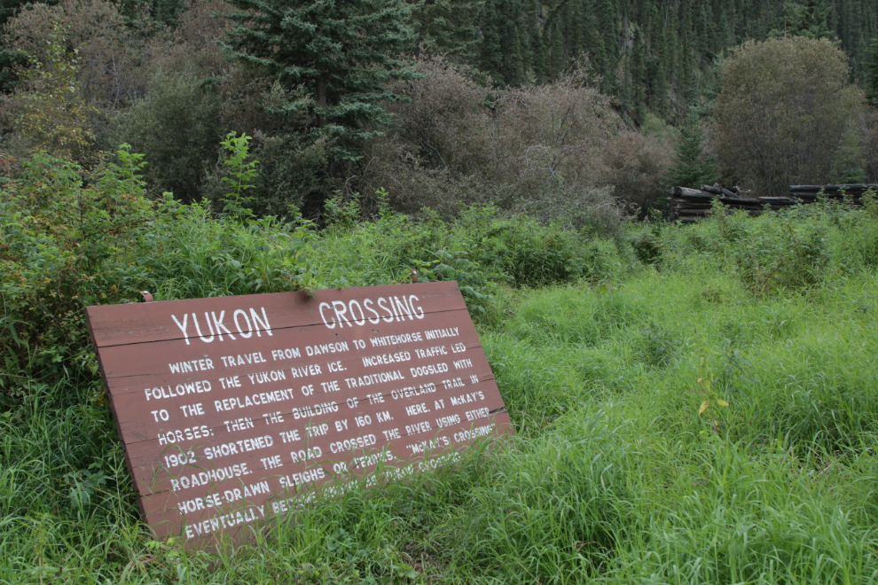 “Winter travel from Dawson to Whitehorse initially followed the Yukon River ice. Increased traffic led to the replacement of the traditional dogsled with horses; then the building of the Overland Trail in 1902 shortened the trip by 160 km. Here, at McKay’s Roadhouse, the road crossed the river using either horse-drawn sleighs or ferries. ‘McKay’s Crossing’ eventually became known as Yukon Crossing.”