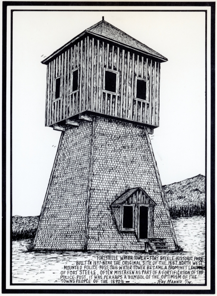 In May 1975, Ray Mannix published 8 of his pen-and-ink drawings of Fort Steele, including the water tower. You can see all of those prints here.